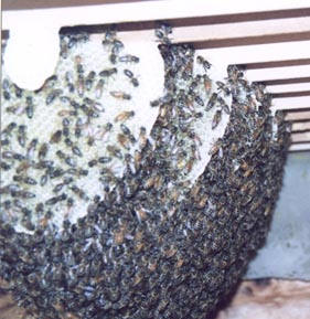 وهكذا تبدو من الداخل وكيف يبني النحل أقراص الشمع فيها قرصاً بعد الآخر من الشمع الأبيض الجديد. |